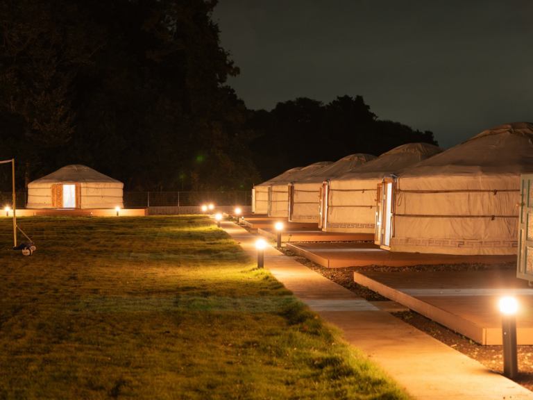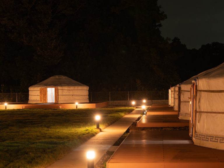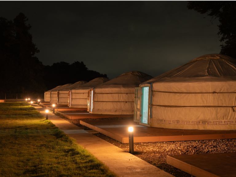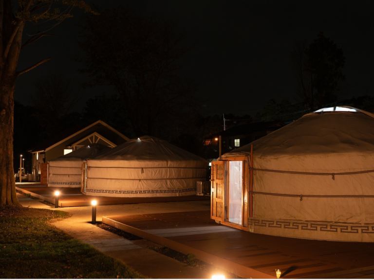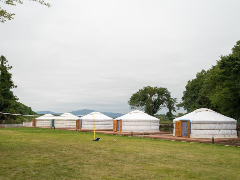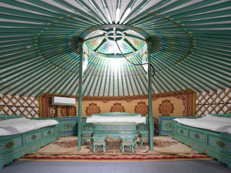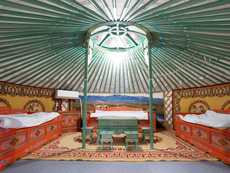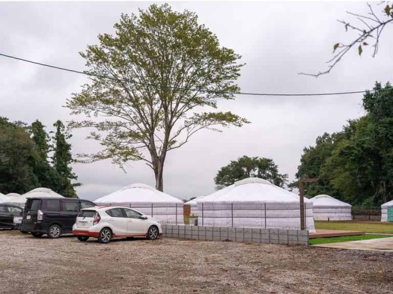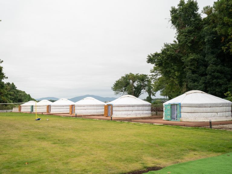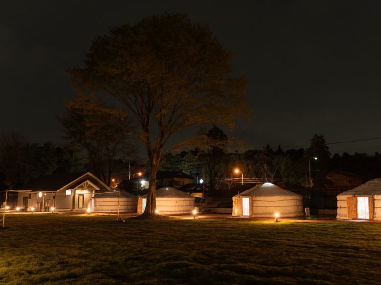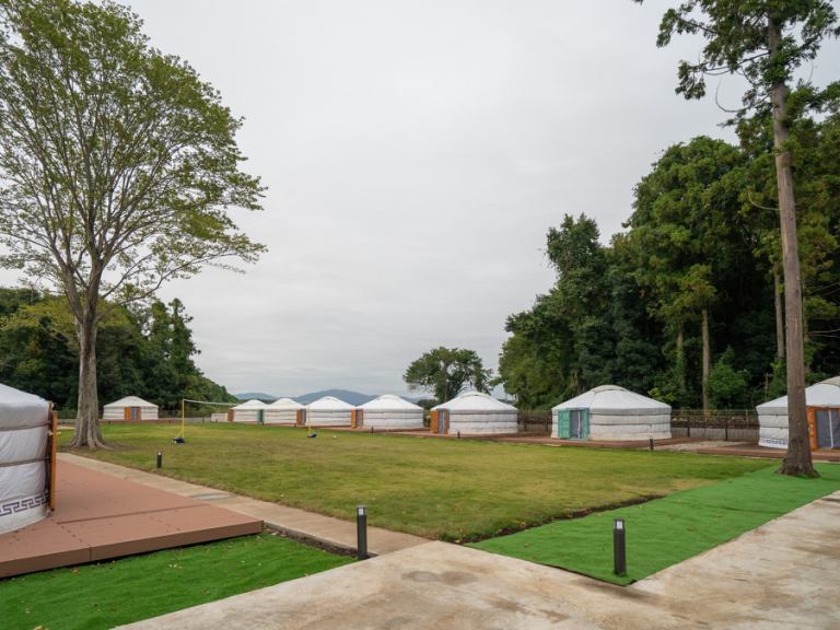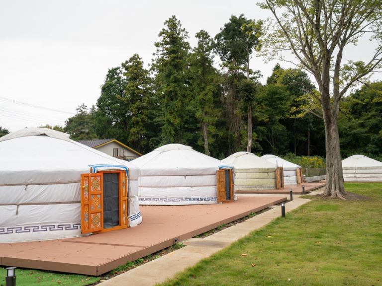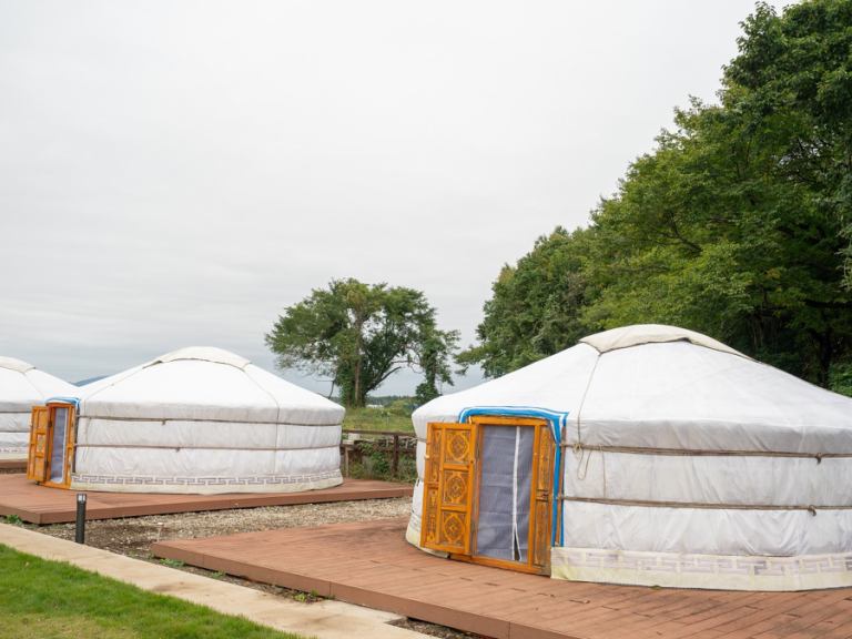 木陰の中に彩り豊かなゲルが並ぶ、穏やかなひと…